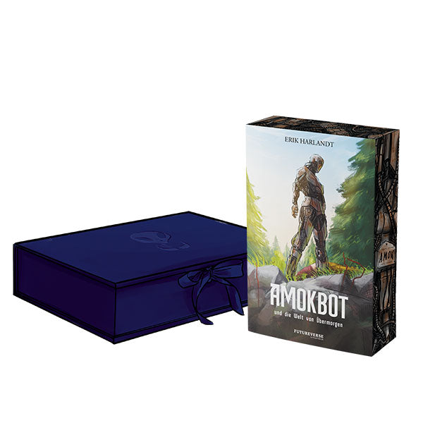Tauche ein in die Outerverse Awakening Box zu „Amokbot und die Welt von übermorgen“ von Erik Harlandt und begleite einen Amokbot auf seiner Reise von Zerstörung zu Menschlichkeit.